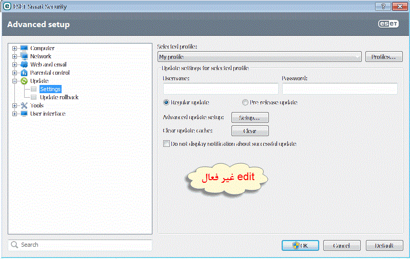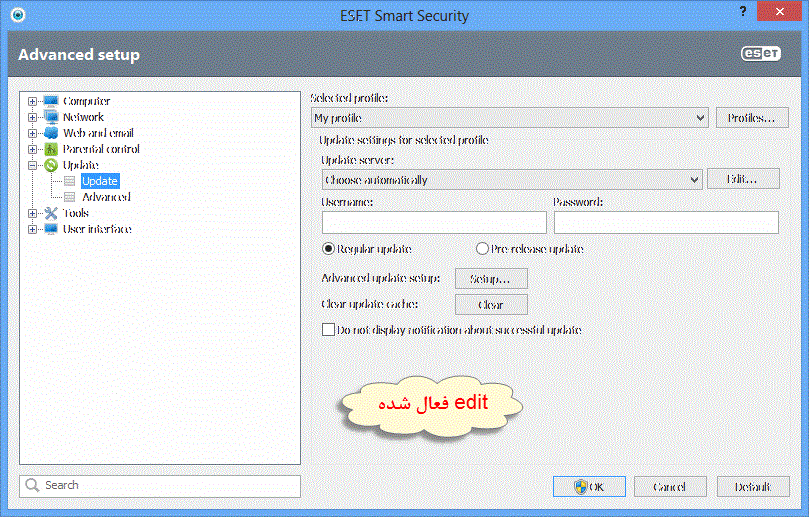 برای اینکه بتوانید آپدیت آفلاین را در آنتی ویروس نود 32 نسخه 5 و 6 و 7 و8 انجام دهید باید دکمه Edit را برای انتخاب سرور فعال کنید.