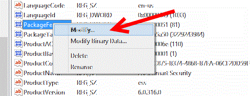 و در سمت راست پنجره مقدار PackageFeatures را پیدا کرده و بر روی آن دوبار کلیک میکنیم یا بر روی آن راست کرده کلیک و گزینه Modify را انتخاب میکنیم.