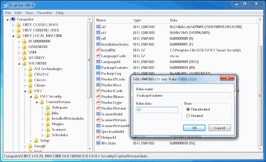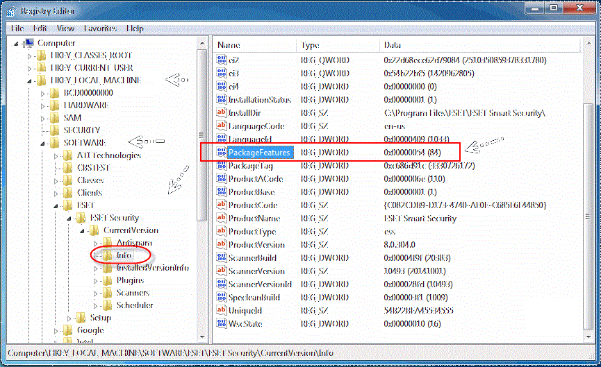 HKEY_LOCAL_MACHINE/SOFTWARE/ESET/ESETSecurity/CurrentVersion/Info