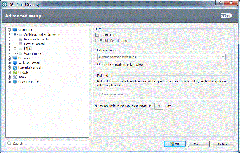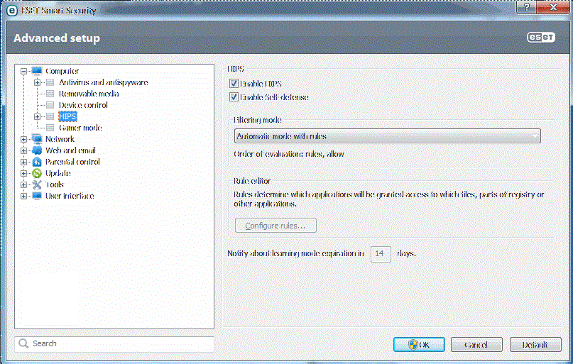 مرحله 2: با زدن علامت + در زیر شاخه گزینه HIPS را انتخاب کرده و در سمت راست پنجره باید تیک گزینه Enable Self-defense و بعد گزینه Enable HIPS را بردارید.(بدون تیک باشند)